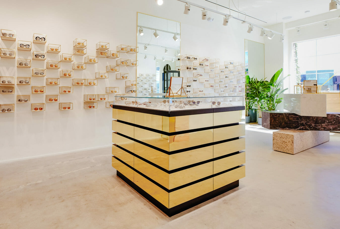 Featuring luxurious raw-meets-refined fixtures made from pink marble, polished concrete, onyx, and brass, the 1,055-square-foot space offers the brand's statement-making women's and men's optical and sun collections, including its frames with 24-karat gold, platinum, and rose gold lenses and collabs with Alessandra Rich, Dries van Noten, N21, and Matthew Williamson. (Of course, there's a nod to California's indoor/outdoor lifestyle with potted foliage.)