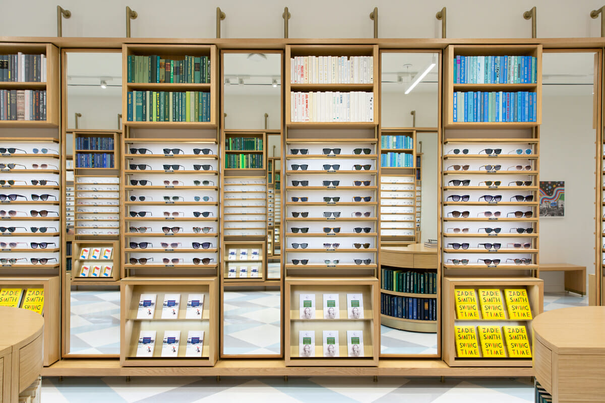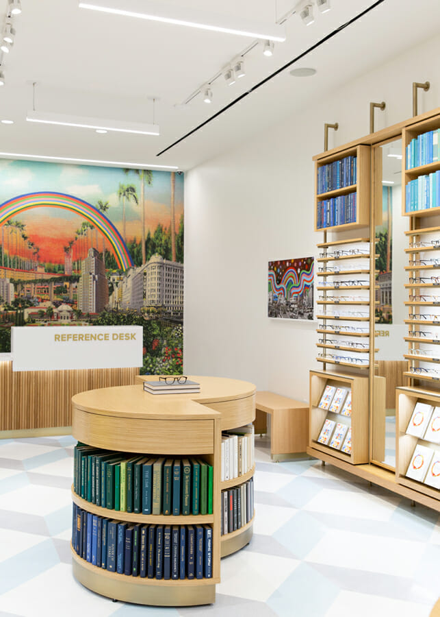 About that SFV specs shop (12182 1/2 Ventura Blvd.): The 1,614-square-foot space features Valley-inspired artwork by Alia Penner — who worked with the brand on its first TV commercial — alongside custom geometric-patterned flooring, light oak shelves, and brass accents. (All of Warby Parker's locations boast custom murals by independent artists and locally-inspired touches.)