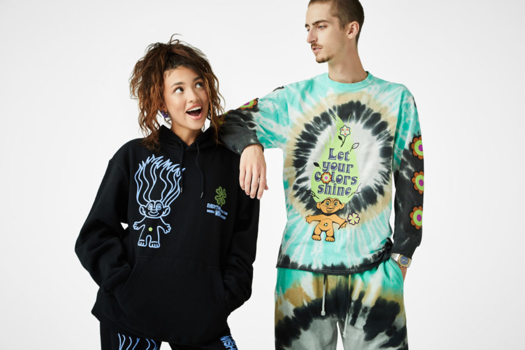 Unisex tees feature Big Lebowski, Hot Stuff, Richie Rich, Fast & Furious, The Breakfast Club, and Universal Monsters while the classic Felix the Cat appears in a variety of colors and patterns in a varsity-style aesthetic across beanies, skirts, shirts, jackets, sweaters, tees, and more. Good Luck Trolls combine with positive affirmations and tie-dye for a collection of sweatshirts, sweatpants, tees, and totes.